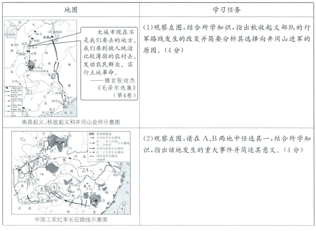 (1)第一小问,根据材料“南昌起义、秋收起义和井冈山会师示意图”并结合所学知识可知,1927年9月,毛泽东在湘赣边界发动秋收起义,起义开始时比较顺利,攻占了一些县城,但由于城里敌人力量强大,起义军受到严重挫折,为保存革命力量,毛泽东决定放弃攻打中心城市长沙的计划,改向敌人统治力量薄弱的山区进军。第二小问,结合所学知识可知,为保存革命力量;井冈山地区敌人统治力量薄弱,有良好的群众基础,有利于发动农民群众;井冈山地区地势险要,易守难攻;井冈山地区周边农业经济可供部队筹措给养;等等。