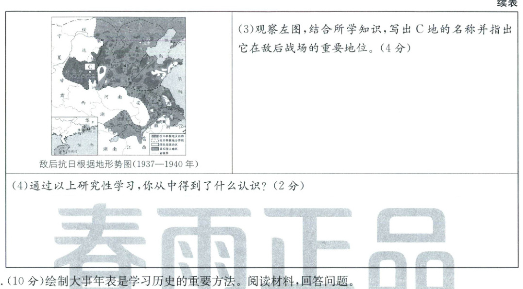 (3)第一小问,根据材料“敌后抗日根据地形势图(1937—1940年)”可知,C地是延安。第二小问,结合所学知识可知,延安是敌后战场的战略总后方和指挥中枢。