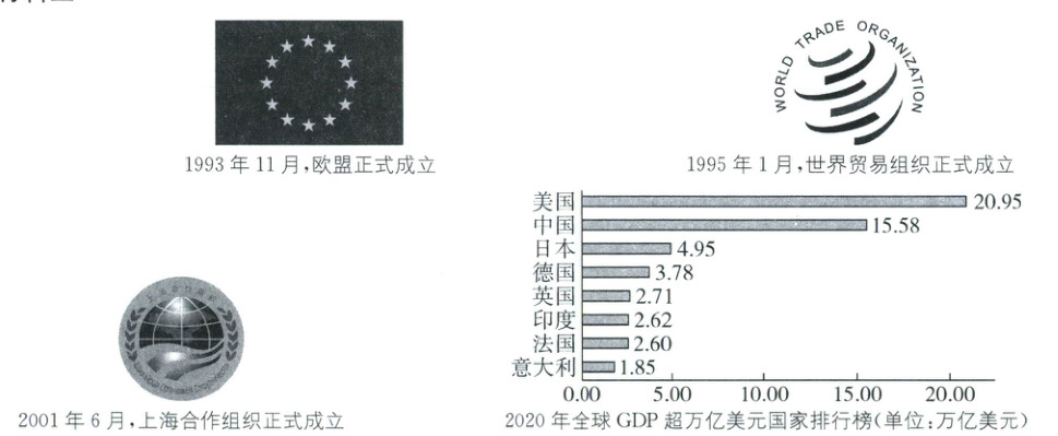 (3)根据材料三“欧盟”“世界贸易组织”“上海合作组织”“GDP超万亿美元国家排行榜”并结合所学知识,从时代主题、经济全球化、政治多极化等方面概括即可。