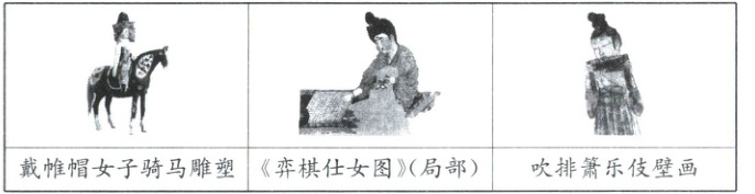 3.A 解析 本题考查唐朝开放的社会风气。根据材料图片可知,唐代女性可参与户外骑马活动以及弈棋、音乐等娱乐文化活动,说明唐代社会风气比较开放,故A项正确;材料未涉及民族关系与中外交流,排除B、C项;材料图片以社会生活场景为主,体现的是绘画和雕塑艺术,而非文学艺术,排除D项。