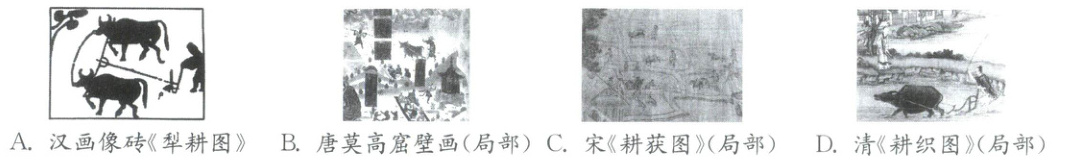 5. 约成书于 880 年的《耒耜经》是一本古农具专志,书中记述曲辕犁时写道:“辕之上又有如槽形,亦如箭焉……进之则箭下,入土也深;退之则箭上,入土也浅……江东之田器尽于是。”下列选项能够印证该记载的是(