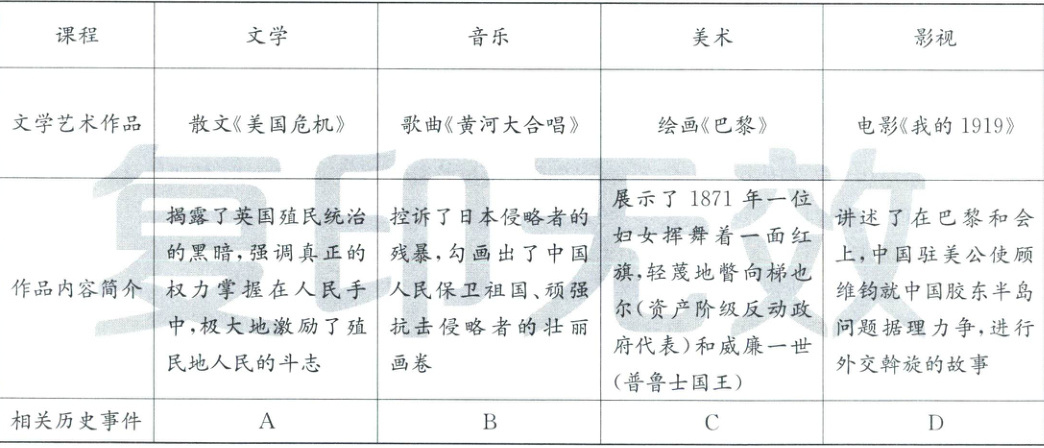 (1)根据材料“散文《美国危机》”“揭露了英国殖民统治的黑暗,强调真正的权力掌握在人民手中,极大地激励了殖民地人民的斗志”可知,A对应的是②美国独立战争;根据材料“歌曲《黄河大合唱》”“控诉了日本侵略者的残暴”可知,B对应的是④抗日战争;根据“绘画《巴黎》”“展示了1871年一位妇女挥舞着一面红旗,轻蔑地瞥向梯也尔(资产阶级反动政府代表)和威廉一世(普鲁士国王)”可知,C对应的事件是①巴黎公社革命;根据材料“电影《我的1919》”“讲述了在巴黎和会上,中国驻美公使顾维钧就中国胶东半岛问题据理力争,进行外交斡旋的故事”可知,D对应的历史事件是③五四运动。