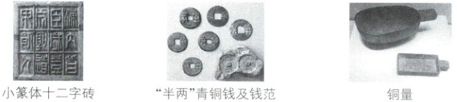 2.C 解析本题考查秦朝巩固统一的措施。根据材料“小篆体十二字砖”“半两’青铜钱及钱范”“铜量”并结合所学知识可知,秦始皇统一文字,制定笔画规整的小篆,作为通用文字颁行全国;下令废除六国的货币,以秦国的圆形方孔半两钱作为统一货币;规定以秦制为基础,统一度量衡制度。这些均是秦朝为巩固国家统一而推行的重要措施。故选C项。