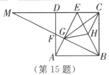 15. 如图,在正方形$ABCD$中,$E,F$分别为$CD,AD$的中点.连接$BF$并延长交$AE$于点$G$,交$CD$的延长线于点$M,H$为$BE$的中点,连接$GH,CH,CG$.下列结论:①$CH// AE$;②$\angle M=30^{\circ}$;③$S_{\triangle CGH}=\frac{3}{20}S_{ 正方形ABCD}$;④$AG· MF=CD· AF$.正确的是