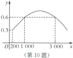 A.当x≥1000时,y随x的增大先增大、后减小,即A选项错误,不符合题意;B.由函数图象可知,抛物线的对称轴为x=$\frac{1000+3000}{2}$=2000,即当x=2000时,y有最大值,即B选项正确,符合题意;C.当y≥0.6时,1000≤x≤3000,即C选项错误,不符合题意;D.当y=0.4时,由函数图象可知,x对应的值有两个,即D选项错误,不符合题意.故选B.