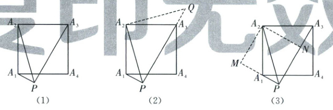 如图(1),已知 $P$ 是正方形$A_{1}A_{2}A_{3}A_{4}$外一点,且满足$\angle PA_{1}A_{2}+\angle PA_{3}A_{2}=180^{\circ}$,探究$PA_{1}$,$PA_{2}$,$PA_{3}$三条线段的数量关系.