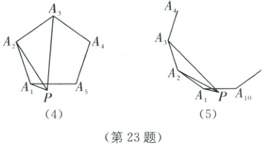 (3)如图(5),若 $P$ 是正十边形$A_{1}A_{2}·s A_{10}$外一点,且满足$\angle PA_{1}A_{2}+\angle PA_{3}A_{2}=180^{\circ}$,则$PA_{1}$,$PA_{2}$,$PA_{3}$三条线段的数量关系为