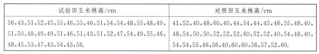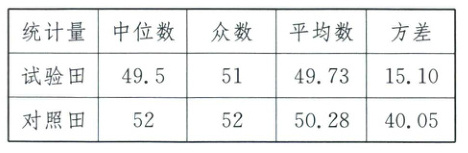(4)从中位数、众数、平均数来看,试验田略低于对照田,且均在长势良好范围内;而从方差看,试验田明显低于对照田,说明试验田玉米株高数据波动小,相对集中.综合以上信息,试验田长势好于对照田.