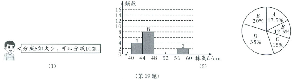 (3)已知此生长期的玉米株高$h$满足$48 cm \leq h<56 cm$为长势良好. 比较以上两个统计图,写出图中蕴含的信息(一条即可).