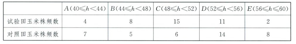 19. (本小题满分12分)为培育玉米新品种,研究人员对某生长期试验田和对照田中的玉米株高进行抽样调查并作比较研究,分别随机选取40株玉米测量其株高,整理数据如下.