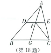 18. (本小题满分12分)如图,在$\triangle ABC$中,点$D,E,G$分别是边$AB,AC,BC$的中点,$DE$与$AG$相交于点$F$,连接$CF,AG=AC$. 证明: