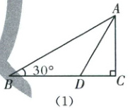 (1)[探索发现]东营市全面落实国家课程方案.某校开设了纸艺课程,三个项目组在折纸活动中发现:在$Rt\triangle ABC$中,$\angle ACB=90^{\circ}$,$\angle ABC=30^{\circ}$,折叠$\triangle ABC$,使 AC 边落在 AB 边上,折痕为 AD,则 BD,CD 与$\angle BAC$的两边 AB,AC 存在着某种关系.如图(1),请你帮助项目组判断$\frac{AB}{AC}$与$\frac{BD}{CD}$的数量关系为