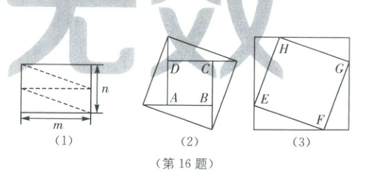 16. 把一张矩形纸片按照如图(1)所示的方式剪成四个全等的直角三角形,四个直角三角形可拼成如图(2)或图(3)所示的正方形. 若矩形纸片的长为$m$,宽为$n$,四边形$EFGH$的面积等于四边形$ABCD$面积的 2 倍, 则$\frac{m}{n}=$