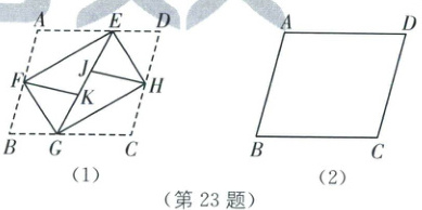 23. (本小题满分 10 分)(1)如图(1),将平行四边形纸片$ABCD$的四个角向内折叠,恰好拼成一个无缝隙、无重叠的四边形$EFGH$. 判断四边形$EFGH$的形状,并说明理由;