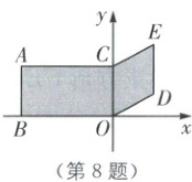 8. 如图,在平面直角坐标系$xOy$中,一张纸片被$y$ 轴分成矩形$ABOC$和平行四边形$CODE$两部分.点$A$的坐标为$(-2\sqrt{3},2)$,点$B$,$C$分别在$x$轴和$y$轴上,点$D$的坐标为$(\sqrt{3},1)$.下列结论: