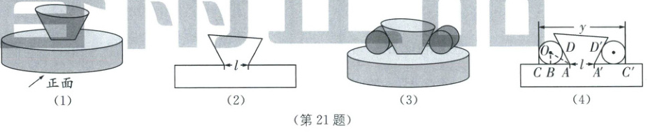 操作步骤:如图(3),将两个钢柱平行放在部件合适位置,使得钢柱与部件紧密贴合. 示意图如图(4),$\odot O$分别与$AC$,$AD$相切于点$B$,$D$. 用游标卡尺测量出$CC'$的长度$y$.