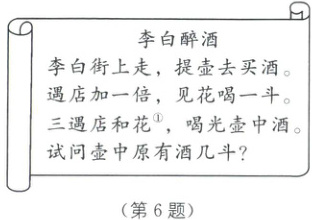 6. 李白是我国唐代著名诗人,“李白斗酒诗百篇”,“诗”与“酒”都与李白有着不解之缘. 后人有《李白醉酒》的数学诗(如图)来描述李白饮酒作诗的豪放情景(①处的大意为先遇店后见花,如此三次),则诗中李白的壶中原来有酒(
