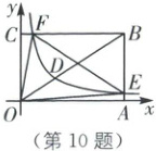 10. 如图,D 为矩形$OABC$(边$OA$,$OC$分别在$x$,$y$轴的正半轴上)对角线$OB$上的点,且$OD = \frac{1}{2} BD$,经过点$D$的反比例函数$y = \frac{k}{x}$的图象分别与$AB$,$BC$相交于点$E$,$F$,连接$OE$,$OF$,$EF$,若$\triangle OBF$的面积是$24$,则$\triangle OEF$的面积为(