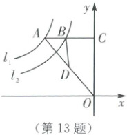 13. 点 A 在反比例函数$y = \frac{14}{x}$的图象上,点 B 在反比例函数$y = \frac{k}{x}$的图象上,连接并延长 AB,交 y 轴于点 C,且$AC ⊥ y$轴,连接 OA,D 是 OA 的中点,$S_{△ABD} = 1.5$,则 k 的值为