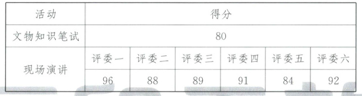 11. 为庆祝故宫博物院建院 100 周年,学校开展了评“星”活动,即根据文物知识笔试和现场演讲两项比赛的综合得分,评选出学校的“文化传承之星”.其中现场演讲由 6 位评委打分,其比赛成绩为去掉最高分和最低分后的平均分.小丽的得分如表,若文物知识笔试和现场演讲两项成绩按 4 : 6 的比例确定综合得分,则小丽的综合得分为
