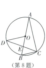 8. 如图,AB 为⊙O 的直径,点 C,D 在⊙O 上,CD 与 AB 交于点 E,连接 OD,BC,AC,$OD // BC$,$∠A = 24^∘$,则$∠D$的度数为().
