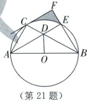 21. (本小题满分 12 分)如图,$\triangle ABC$ 内接于$\odot O$,$AB$ 为$\odot O$ 的直径,$\angle BAC$ 的平分线交$BC$ 于点$D$,交$\odot O$ 于点$E$,过点$C$ 作$CF // AE$ 交$BE$ 的延长线于点$F$,连接$OD,OD\perp AB$.