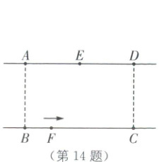14. 如图,是一条宽度为 12 米的河流,在河的岸边有距离相等的三点$A$,$E$,$D$,点$B$,$C$是对岸的两点,分别与点$A$,$D$对应,$F$是点$B$,$C$间的动点,它从点$B$向点$C$运动.已知点$A$,$D$间的距离为 20 米,则点$F$与点$A$,$E$的距离和的最小值为