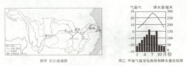 ,注入东海。(2)结合图乙,分析长江的水文特征。(从流量、汛期、结冰期等方面说明)
