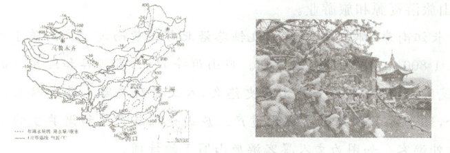 (2024 上·河北承德)2023 年 3 月,受寒潮影响,我国北方多地迎来降雪,因正值桃花盛开季节,故称“桃花雪”。图为我国 1 月气温与年降水量分布及“桃花雪”景观图。读图,完成下面小题。
