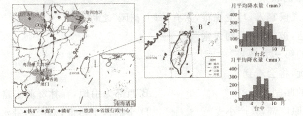 材料三:我国南部部分区域图、台湾省简图、台北和台中月平均降水量柱状图。