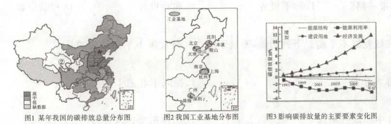 工业基地。(3) 读图3,造成我国碳排放量增加的主要因素是