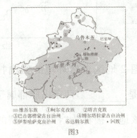 (3)新疆自古以来就是多民族聚居地区。 读图 3 新疆主要民族分布图可知,新疆主要的少数