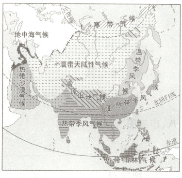 (2)受纬度位置、海陆位置和地形的综合影响,亚洲的气