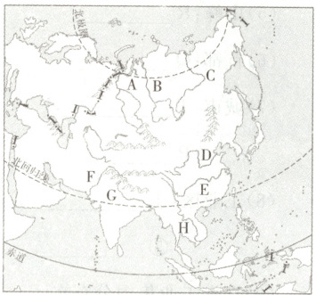 。(均填字母)(3)受地形的影响,亚洲的大河多发源于中部山地、高原,呈