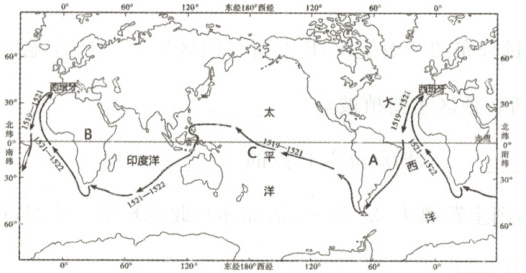 (1)1519年9月,麦哲伦船队从西班牙出发,渡过大西洋,绕过A