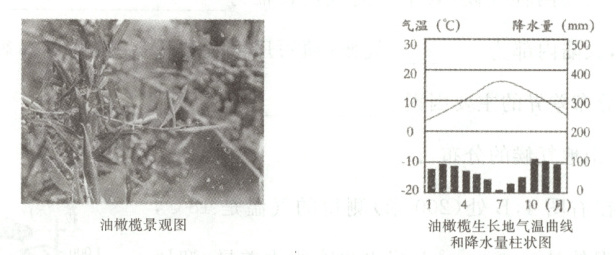 (2024·山东滨州·中考真题)油橄榄具有喜温耐旱的特性,根系发达,叶面较硬且具有蜡质层。读“油橄榄景观图”和“油橄榄生长地气温曲线和降水量柱状图”,完成下面小题。