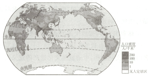 (5)图中的①②③④四地中,属于人口稠密的地区是