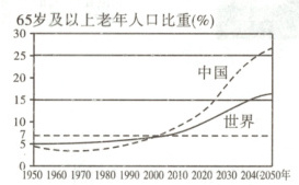 材料二:国际上普遍认为:人口老龄化是指一个国家或地区65岁及以上老年人口占总人口比重达到或超过7%,下图为中国与世界65岁及以上老年人口比重统计与预测图。
