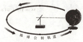 读地球公转演示图(支架顶部的十字架代表“太阳光线”),完成31~32题。