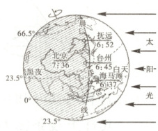 (2023·福建)下图示意地球的昼与夜,在图上标注了模拟算出的某年1月1日我国四地迎来第一缕阳光的北京时间。读图完成37~39题。