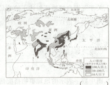 亚洲是世界上面积最广袤、人口最多的大洲,亚洲人口分布不均,经济发展地区不平衡。读亚洲人口分布图,回答下面小题。