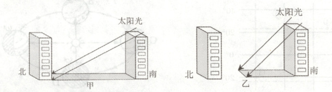 (4)冬季 理由:冬至日太阳直射南回归线,北半球太阳高度角最小,物影最长,最能看出前排楼房是否挡光。