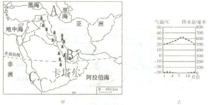 2022 年世界杯足球赛于 11 月 21 日在卡塔尔的首都多哈开幕,决赛在 12 月 18 日进行,这是首次在“冬季”举办世界杯。读西亚地图(甲)和多哈气温曲线与降水量柱状图(乙),据所学知识完成下面各题。