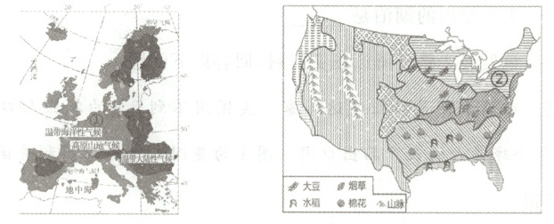 【新考向·区域对比分析·欧洲西部与美国】读欧洲西部气候类型分布和美国本土农业带分布示意图,完成下面小题。