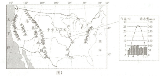 美国和以色列都属于世界农业发达国家。美国用不到 3%的农业人口养活全国 3 亿多人,同时长年稳居全球最大的农产品出口国。图 1 为美国本土地形图和美国圣路易斯多年各月气温和降水量图。