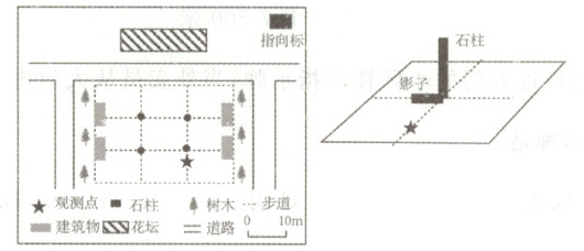 下左图为湖南某广场地图,图中的指向标模糊不清,右图为观测点附近石柱正午时刻影子的位置。读图完成下面小题。