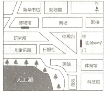 某市实验中学的学生利用周末到博物馆进行社会实践活动。右图为同学们绘制的学校周边区域简图。读图,完成下面小题。