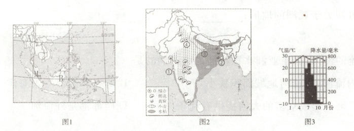 材料一:黄麻适合在温热的气候环境中生长。收获的黄麻在水中浸沤后才能进行初加工以获取制作麻袋、麻布、纸张等的原料。图 2 中②城市为世界最大的麻纺织工业中心,也是该地区联系河运和海运的重要港口。