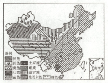(2)写出图中 A、B、C 处主要少数民族名称。