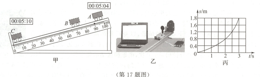 17. (10分)小红用如图所示的实验装置测量小车的平均速度。小车沿斜面从A点由静止释放,图甲中显示测量过程中小车在A、B、C三点的位置及A、C点所对应时间,显示时间的格式是“时:分:秒”。